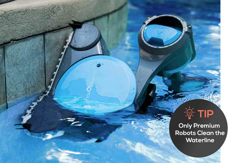 The waterline, sometimes called the tileline, is where debris, algae and bacteria may grow if not cleaned on a regular basis. A robot that leaves this area untouched defeats the purpose of having a pool robot. Robots must have special software, sensors and motors to adhere to and clean the area just above and below the tileline. Robots sold at lower price points, normally those under $1000, do not have the ability to clean the waterline.