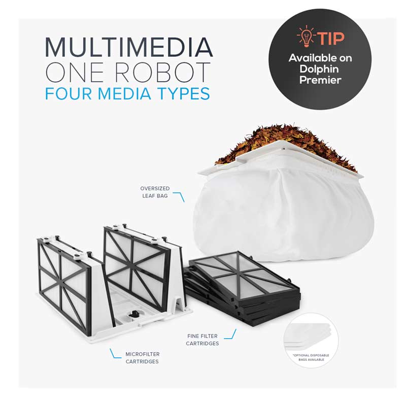 Does your pool get a lot of leaves and debris? Dolphin Premier has the answer with Multi-Media. Rated as the Best Dolphin Pool Robot, you can choose the right media for the job. Want to clean fine debris and algae that passes through other pool cleaners? Choose MicroFilter. Need to pick up a bushel of leaves? Go oversided leaf bag.